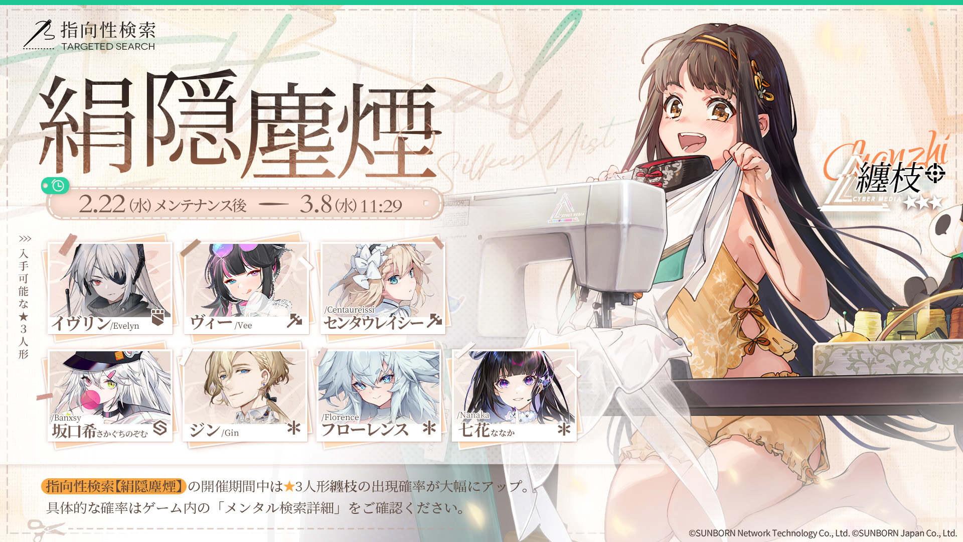 【纏枝 出現率UP】「2月22日(水) メンテナンス後」より、★3シューター「纏枝(CV: #伊瀬茉莉也)」の出現率がアップする指向性検索「絹隠塵煙」を開催。